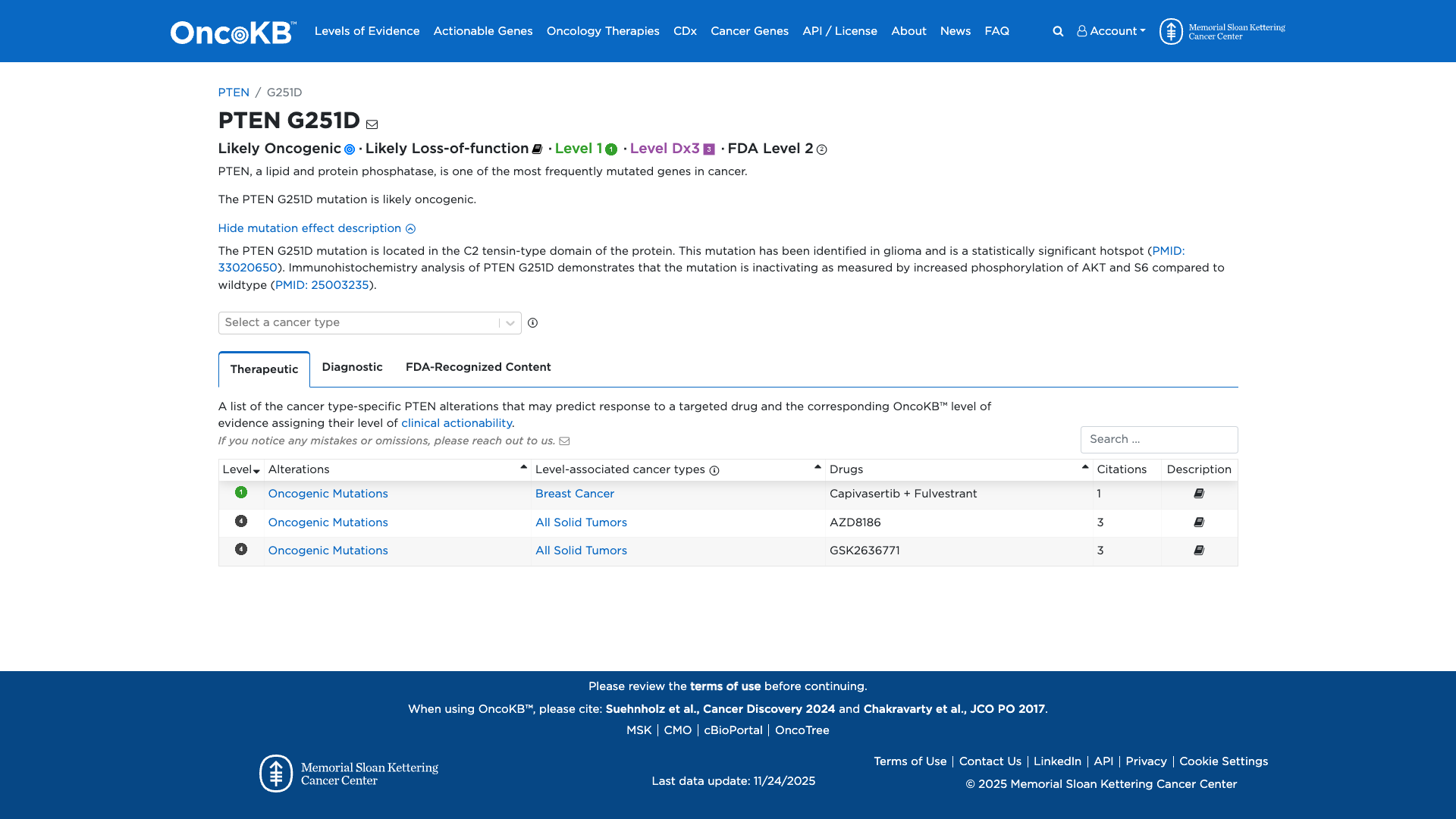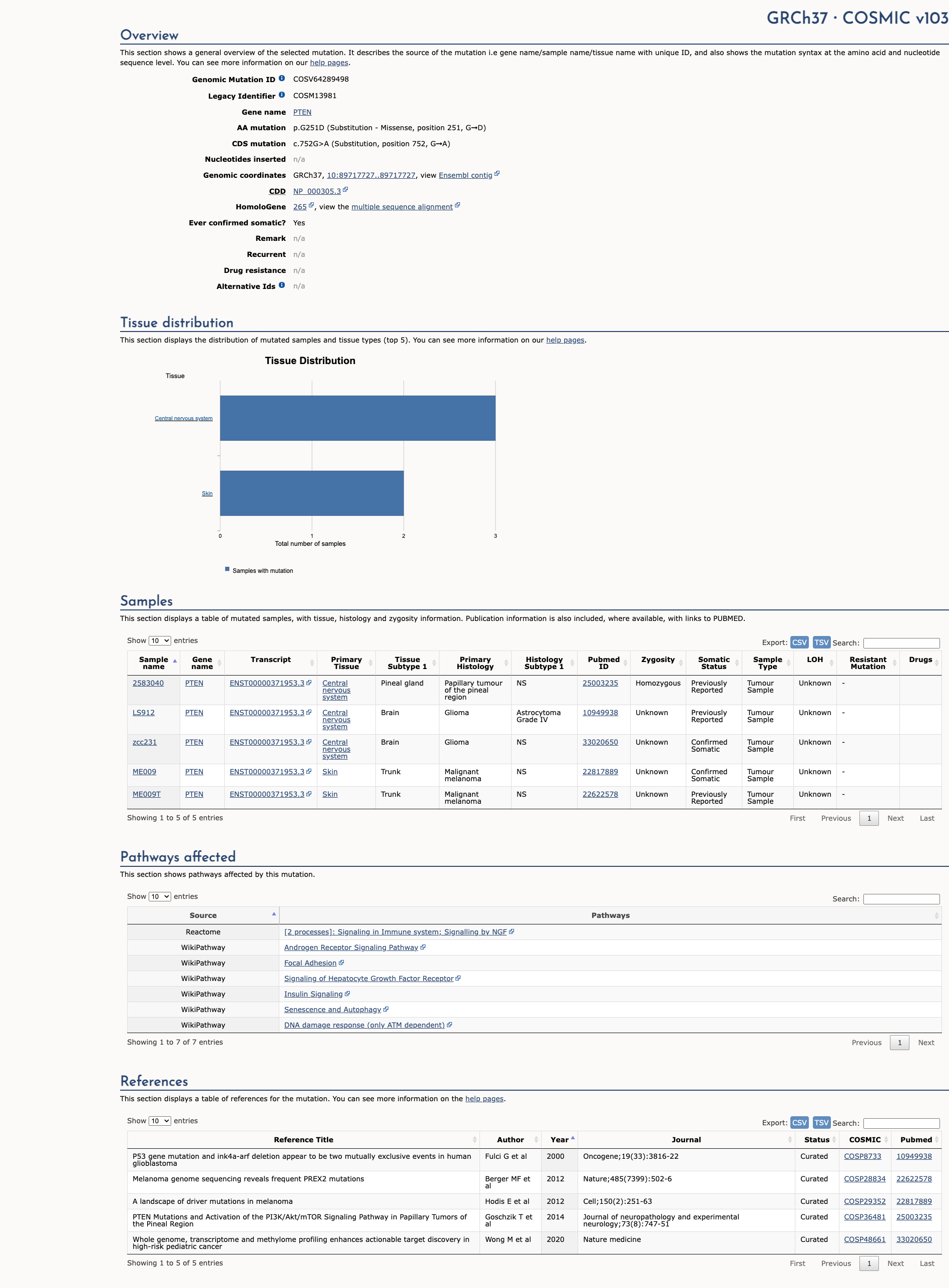 The PTEN G251D variant is located in the C2 tensin-type domain and is associated with decreased PTEN protein levels and increased phosphorylation of AKT and S6, indicating an inactivating effect. However, the variant has not been biochemically characterized to directly assess its impact on PTEN protein function.